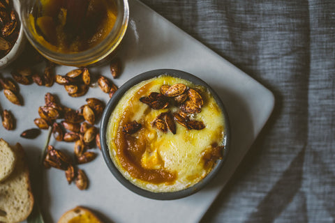 - Heat oven to 400°F. Spoon generous amounts of pumpkin/pear butter on top of St Albans cheese in its crock. Place crock on a baking tray and place in the oven. Bake for 10-15 minutes, until silky soft and melted. Serve with bread, crackers, and fruit.
