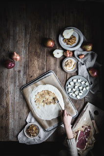 - Spread the pear and shallot puree onto the crust with a rubber spatula, leaving 1-inch bare around the edge for the crust. Top with the sherry caramelized onion, honeyed pears, prosciutto, and Bonne Bouche.