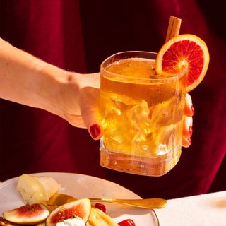- Add ice to cocktail glass with buttered bourbon.