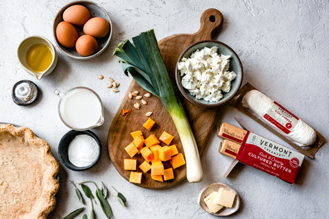 - Layer the roasted squash, cooked leeks, slivered sage, and goat cheese into the parbaked quiche crust.