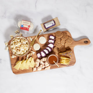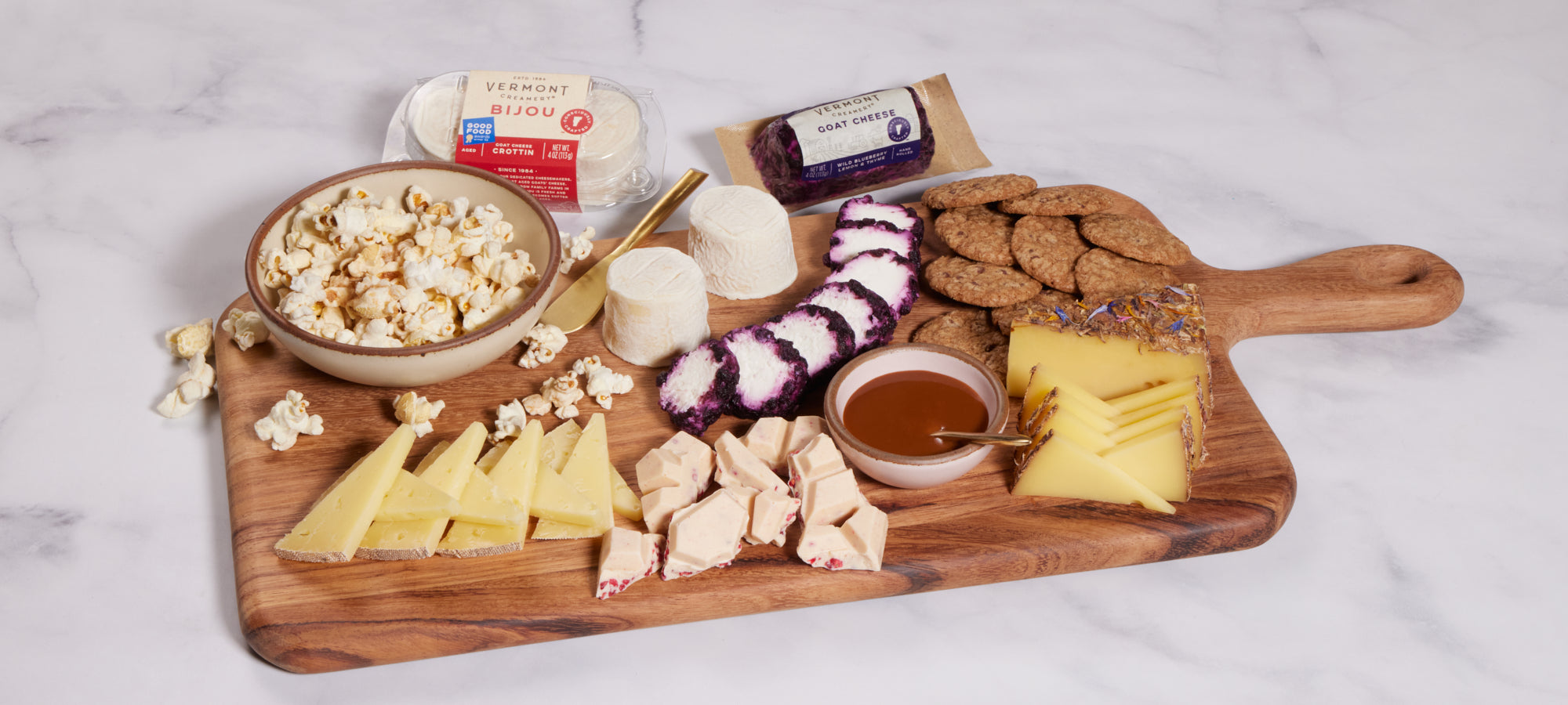 - Place cheeses on board first and cut. Fill in with other items such as chocolate, cookies and popcorn.