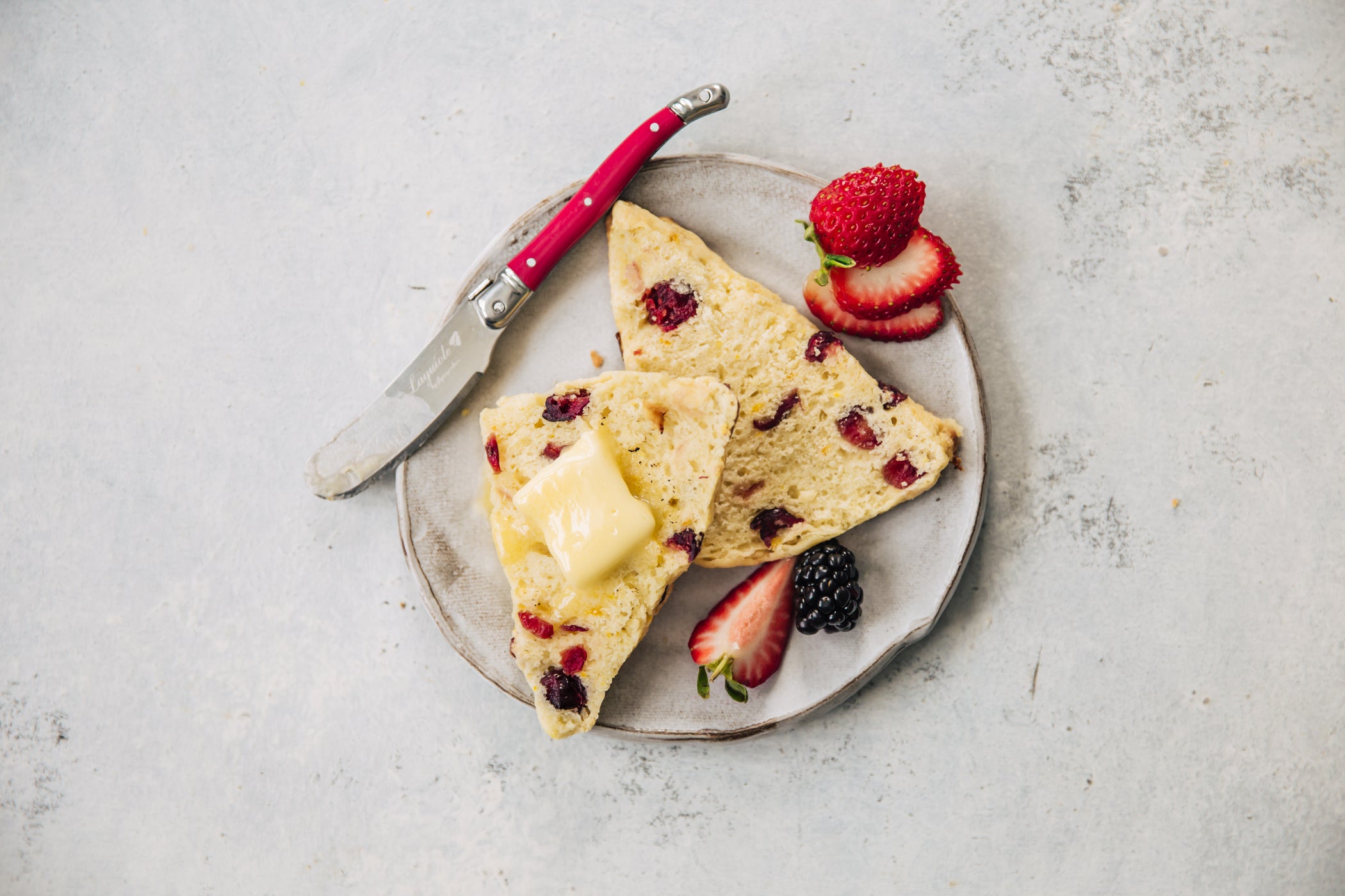 - Combine flour, baking powder and salt in large bowl; cut in butter with pastry blender or fork until mixture resembles coarse crumbs. Stir in dried cranberries,granulated sugar and orange zest. Stir together 3/4 cup buttermilk and egg in small bowl. Stir into flour mixture until well combined.