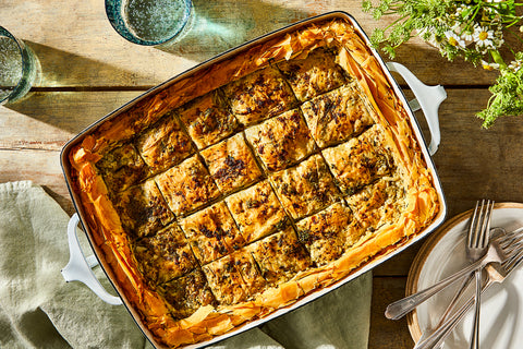 - Using pastry brush, spread melted compound butter on bottom and sides of 13x9-inch baking dish. Keeping stack of phyllo dough covered with damp towel, add 1 sheet phyllo to dish; brush with melted compound butter to coat evenly. Repeat with compound butter until 10 sheets phyllo dough line dish. Coat top phyllo layer with filling, spreading evenly. Top filling with 1 sheet phyllo; brush with compound butter. Repeat for total of 10 sheets phyllo.