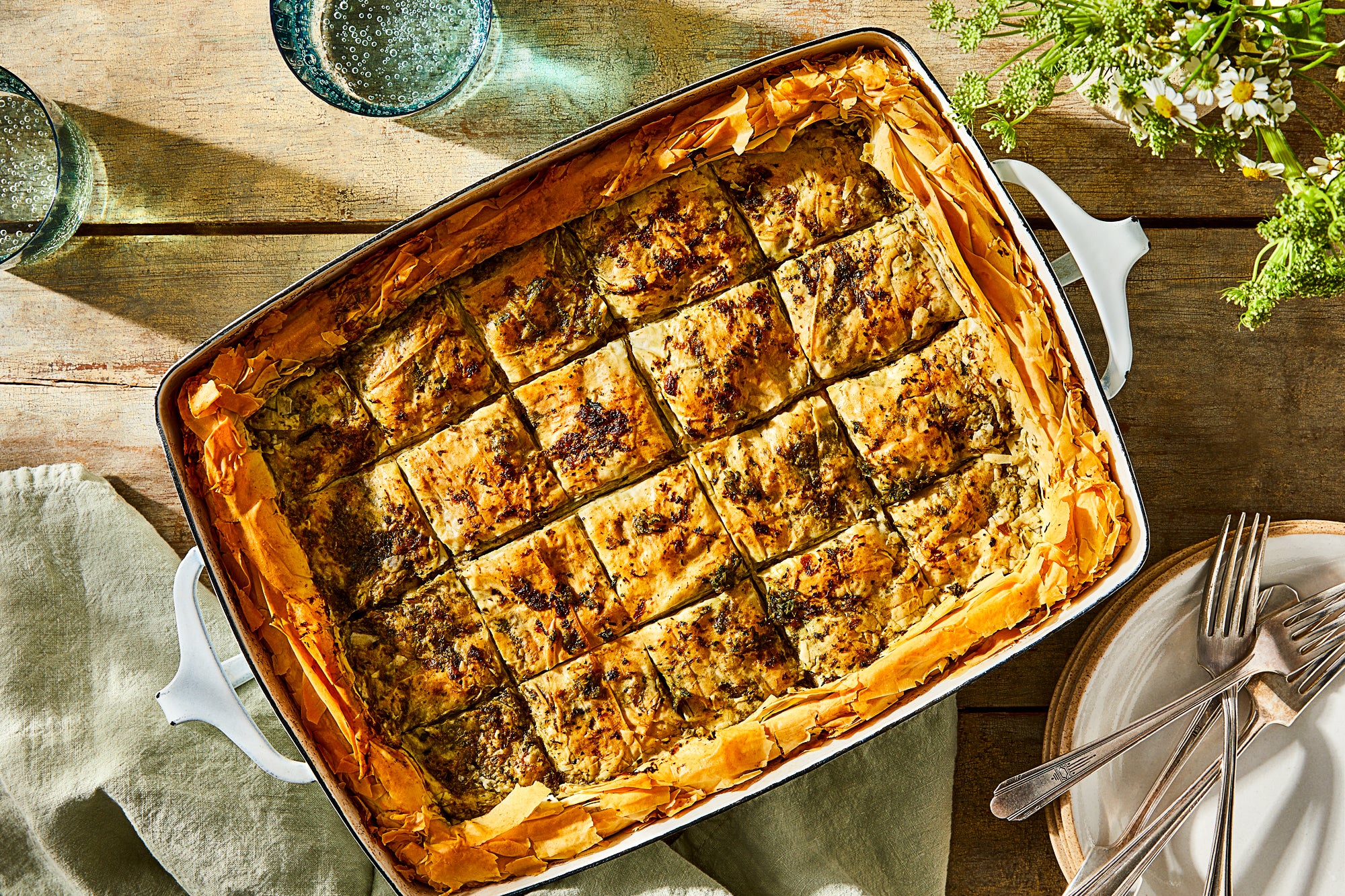 - Fold any excess phyllo out toward sides of baking dish; tuck phyllo in to create pie crust of sorts. Using sharp knife, score pie by slicing top layer of phyllo into 15-20 slices (much easier to do before baking). Bake, rotating baking dish halfway through, 35-45 minutes or until pastry is lightly browned and fully cooked. Remove from oven; sprinkle with sesame seeds, if using. Let cool slightly before serving.
