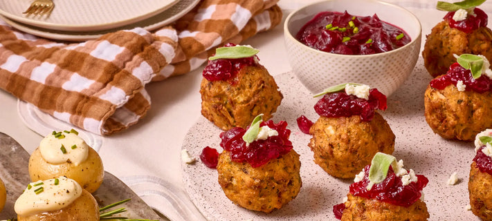 - Serve stuffing balls topped with cranberry sauce, remaining goat cheese, and sage.