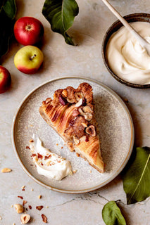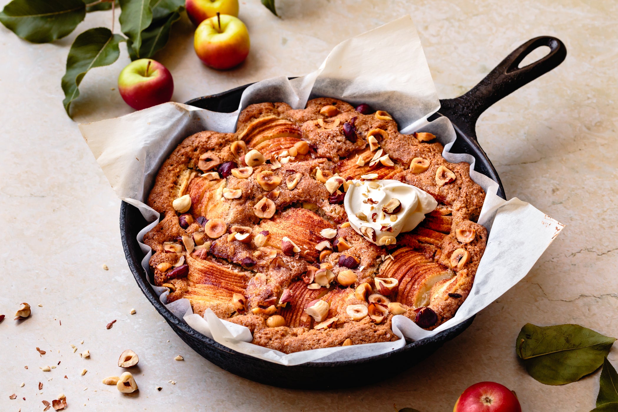 - Scrape the batter into the prepared pan and spread into an even layer. Place the apple slices over the cake, keeping them together, and press them about halfway into the batter. Sprinkle with the chopped hazelnuts. Drizzle with the reserved 1 tablespoon browned butter.