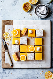 - Just before serving, dust the lemon bars with a bit of powdered sugar. Garnish with lemon wheels and/or whipped crème fraîche if you like.