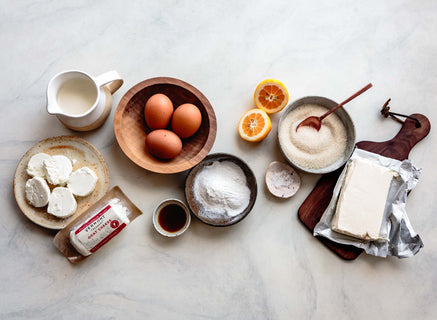 - In the bowl of a stand mixer fitted with the paddle attachment, combine the cream and cheese and goat cheese. Beat on medium speed until smooth. Scrape down the sides of the pan and add ¾ cup sugar, flour, lemon zest, and salt. Beat on medium speed until smooth, 1-2 minutes.