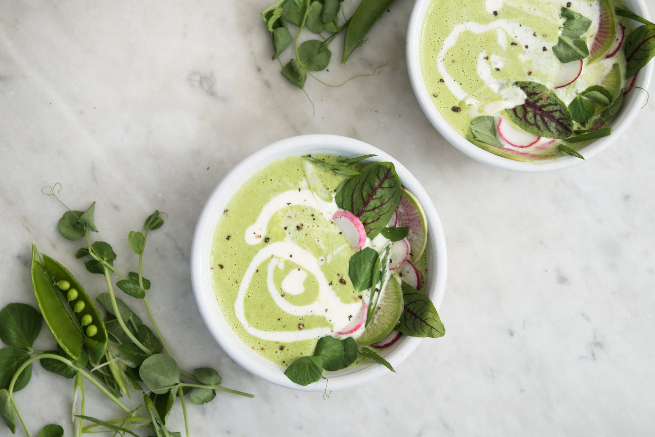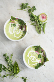 - Ladle soup into bowls; top with dollops of mascarpone, radishes, pea shoots, and green onion.
