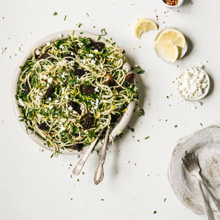 - While pasta is cooking, heat oil in a large skillet until it begins to shimmer. Add in sliced morel mushrooms; stir frequently 4-5 minutes or until they are lightly browned.