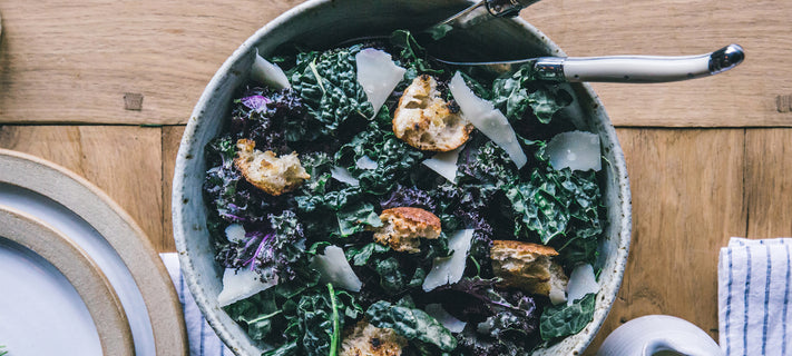 - Pour dressing onto prepared kale leaves and toss well to coat. Add croutons and cheese shavings and gently toss before serving.