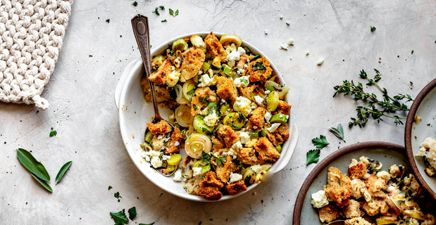 - Place toasted bread pieces in large bowl; add leek mixture, parsley, sage, thyme and pepper. Combine broth and egg; whisk to combine. Pour over bread mixture. Toss well to combine; let stand 5 minutes to absorb a bit of moisture, tossing a few times.