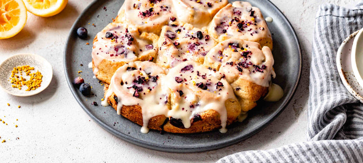 - Spoon the glaze over the warm buns and sprinkle with crumbled freeze-dried berries and bee pollen, if using. Serve warm or at room temperature.
