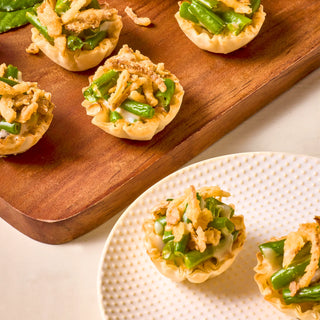 - Divide green bean mixture evenly on top of phyllo shells and top with fried onions.