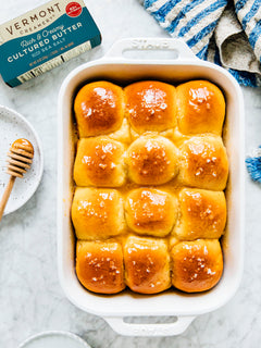 - In the bowl of a stand mixer, whisk together the milk, Vermont Creamery Salted Cultured Butter, honey, and salt. Add the yeast mixture and the egg all at once and mix with a rubber spatula until just combined. Add the flour and mix until a shaggy dough forms, about 1 minute.
