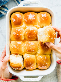 - Make the salted honey topping. In a small saucepan over medium heat, melt the remaining butter. Whisk in the honey to combine. Use a pastry brush to brush the tops of each roll with the salted honey topping immediately after pulling out the rolls from the oven. Garnish with flaky salt.