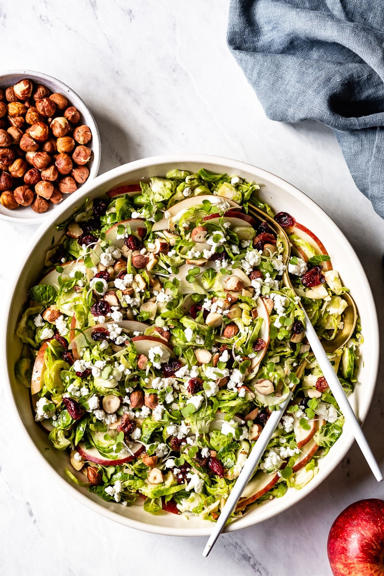 - Place shaved Brussel sprouts in large salad bowl; drizzle with dressing. Give it a toss. Cover with plastic food wrap; let stand 30 minutes