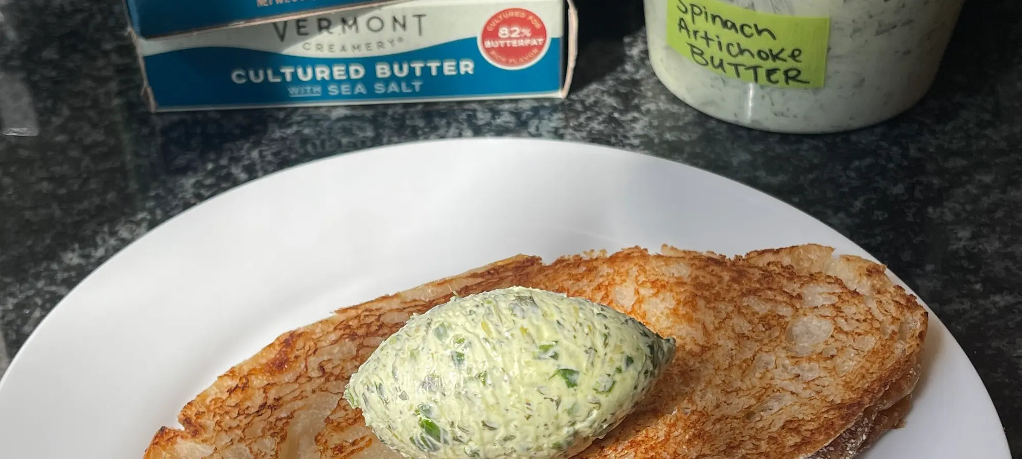 - Add artichoke hearts, spinach, black pepper, roasted garlic and grated parmesan to a food processor and blitz until fine. Add softened butter and blitz until combined.