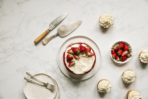 - In a small bowl combine the coffee and Kahlua mixture, and brush onto the sliced sides of the cake. Place one layer on a cake plate and arrange strawberry slices in one even layer. On top of this add a layer of the mascarpone cream. Continue to layer the cake, berries and cream for the remaining two layers.