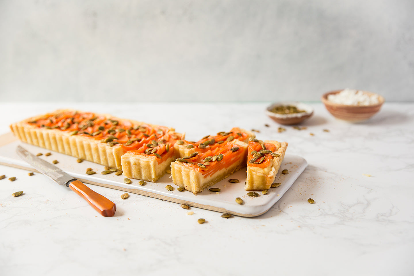 - Layer candied sweet potatoes over baked tart; sprinkle with spiced pepitas. Cut into thick wedges to serve.