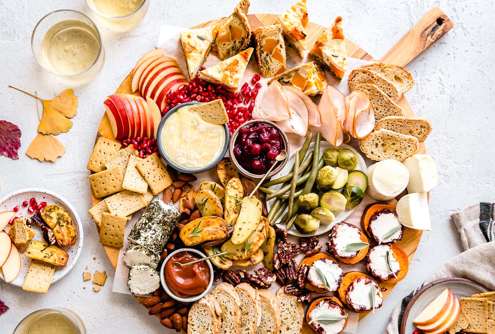 - To assemble the board, place larger components first: quiche wedges, bowls of compote and pickles, sweet potato bites, and cheeses.